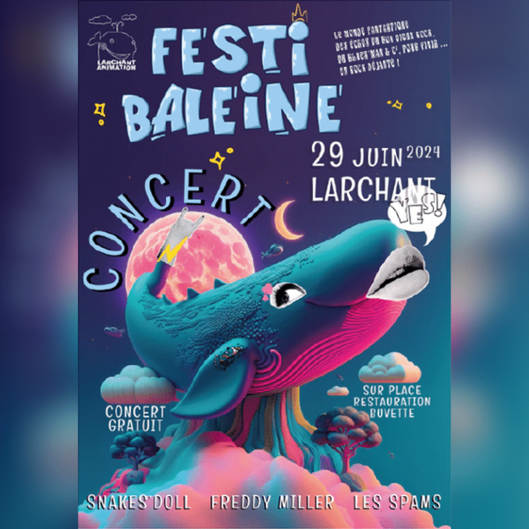 L’historique Festi Baleine organisé par l’association du village Larchant Animation aura lieu une fois de plus sur le site de la Baleine (au bout du chemin des Meuniers). Les bénévoles seront derrière la buvette et la friteuse pour vous abreuver et vous rassasier. Sur scène, trois groupes : Snakes Doll, Freddy Miller et Les Spams pour bouger dans le sable!