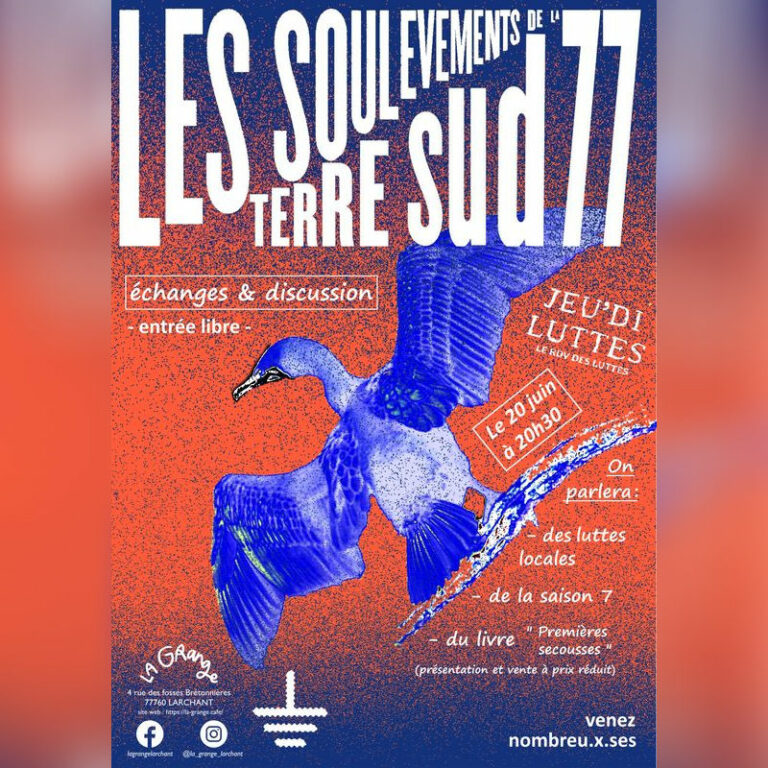 Lors de ce Jeudi Luttes, Premières Secousses, essais écrit par le collectif des Soulèvements de La Terre, sera présenté à La Grange, point relais des SLT. Une occasion d’échanger sur ces luttes multiples qui animent notre quotidien, même lorsque nous couchons nos enfants ou que nous nous brossons les dents, mais aussi de s’organiser pour les prochaines mobilisations (STOP MÉGA-BASSINES le 20-21 juillet notamment).
